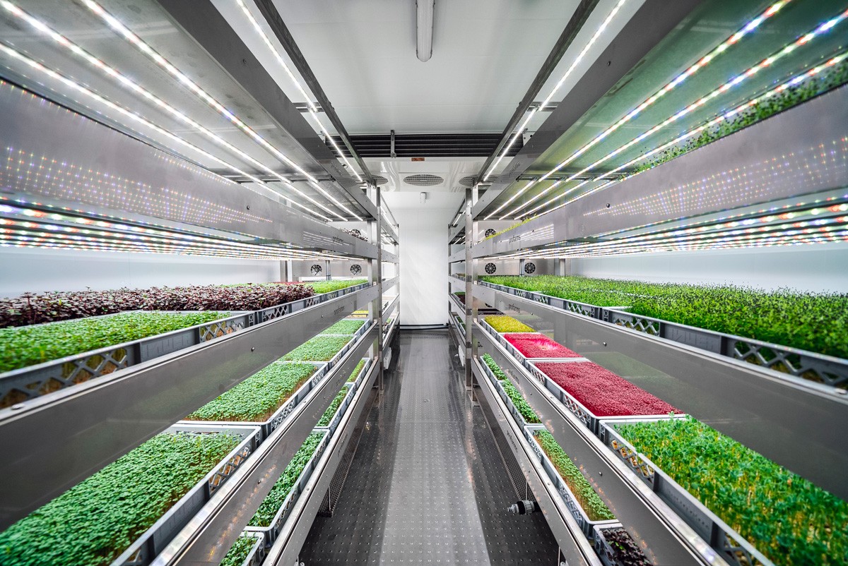 Nach den Wachstumsphasen in den separaten Keim- und Wachstumscontainern lagern wir die fertigen Produkte in einer Kühlzelle, bis sie von Händlern an die Gastronomiebetriebe ausgeliefert werden. Die Pflänzchen sind gekühlt rund drei Wochen ab Werk haltbar.